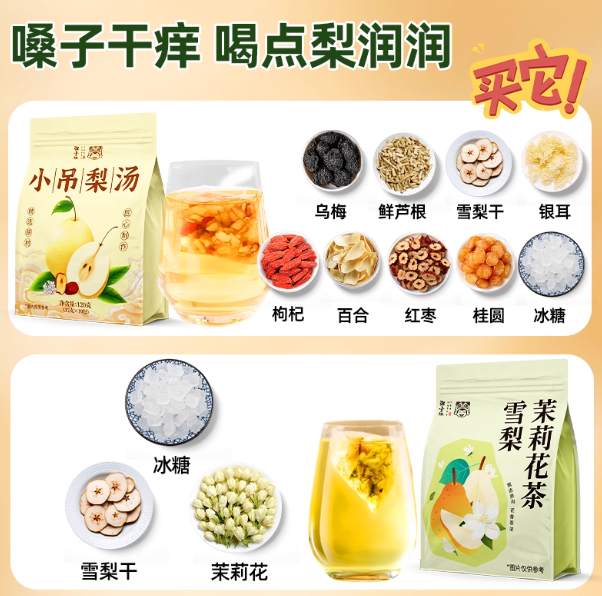 • 冰糖雪梨茉莉花茶小吊梨汤竹蔗茅根金桔雪梨秋冬润燥免煮养生茶包